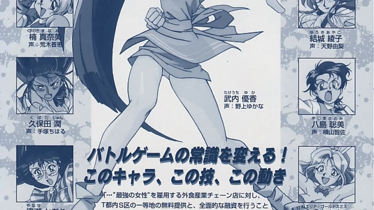 Variable Geo is a Japanese 2D fighting game / eroge developed and published by TGL under their Giga brand. The game focuses on an all-female martial arts competition where participants are required to promote various family restaurants by acting as waitresses when not fighting. Takahiro Kimura was responsible for designing the characters