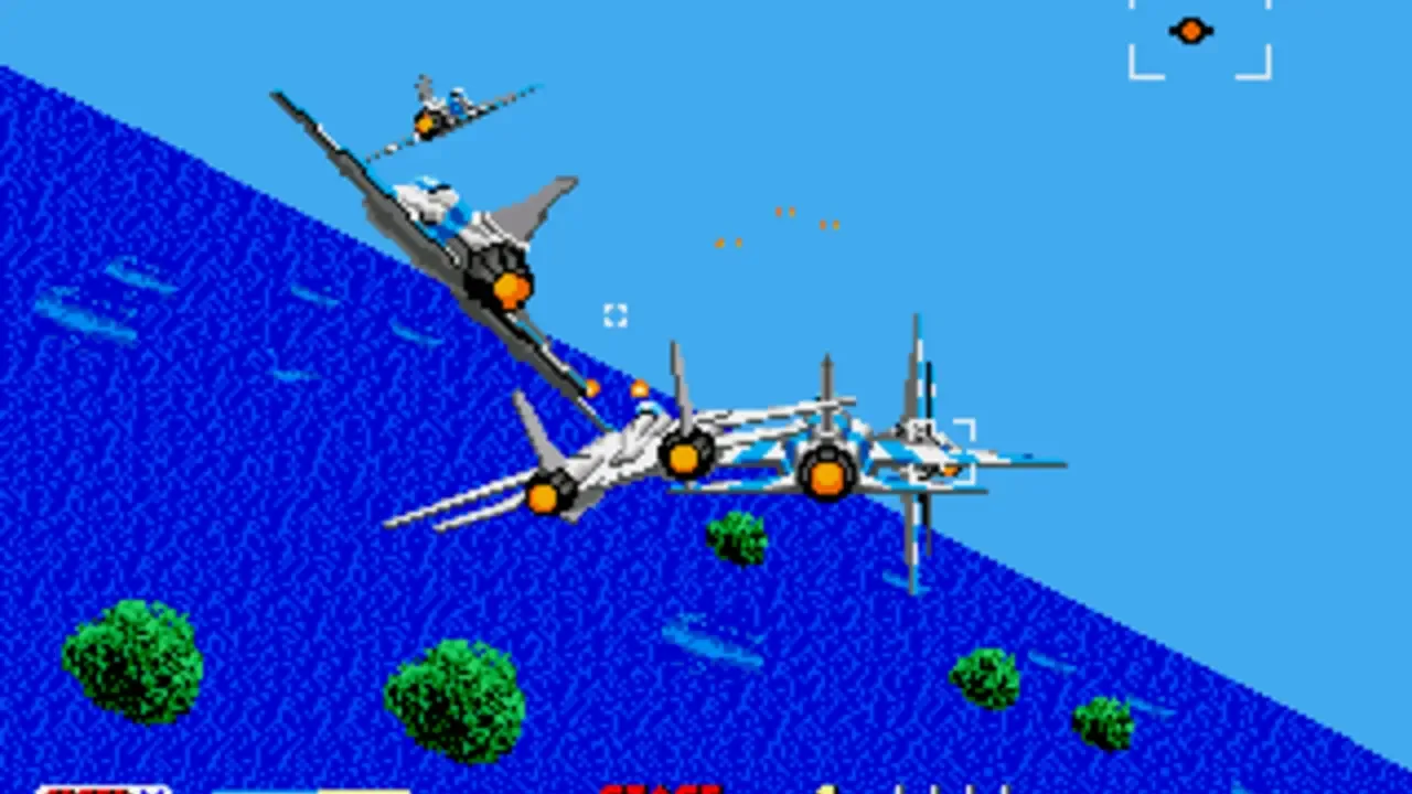 You pilot a fictional airplane called the SSF-14 fighter, using Up to descend and Down to climb it, like in a real fighter plane (although that can be changed in the options under "UP/DOWN"). Playing with a three-button controller A and C fire the vulcan guns, which have infinite ammunition; B is used for missiles, which are limited to 50 at start but get replenished at certain points of the game. Six-button controllers are also supported, with which A rolls, B still shoot missiles, C and Mode fire the vulcan guns, X sets the speed to low, Y speed middle and Z speed high. There are 23 stages in all and upon reaching stages 5, 9, 13 and 19, allows you to continue the game from the respective stage, through a new option at the title screen. Despite its title, this game is actually a port of After Burner II.