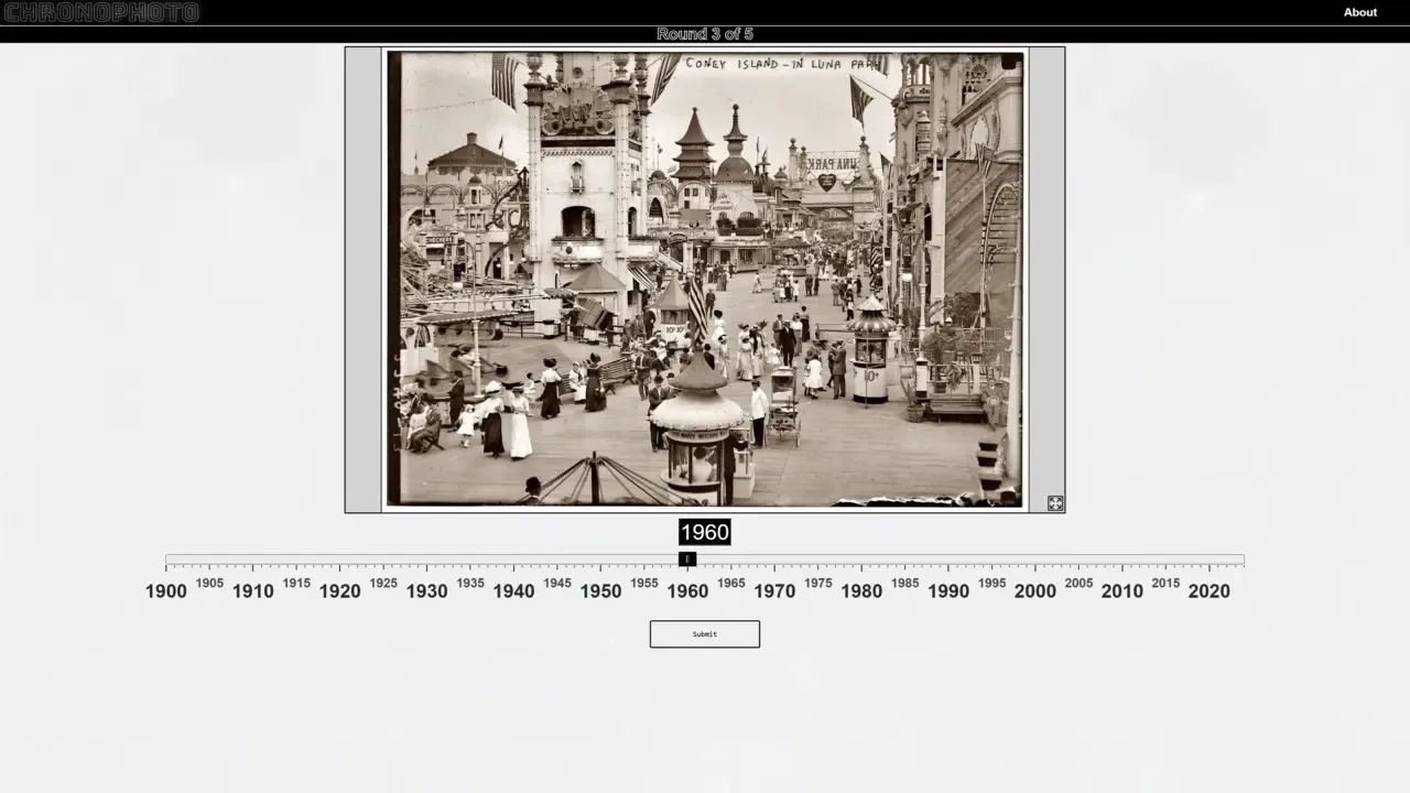 A game of simulated historical and geographical knowledge. Players must pinpoint the location of a photograph and the year by dropping a location pin on a map and select the year the photograph was taken. Points are awarded for distance from correct location and year.