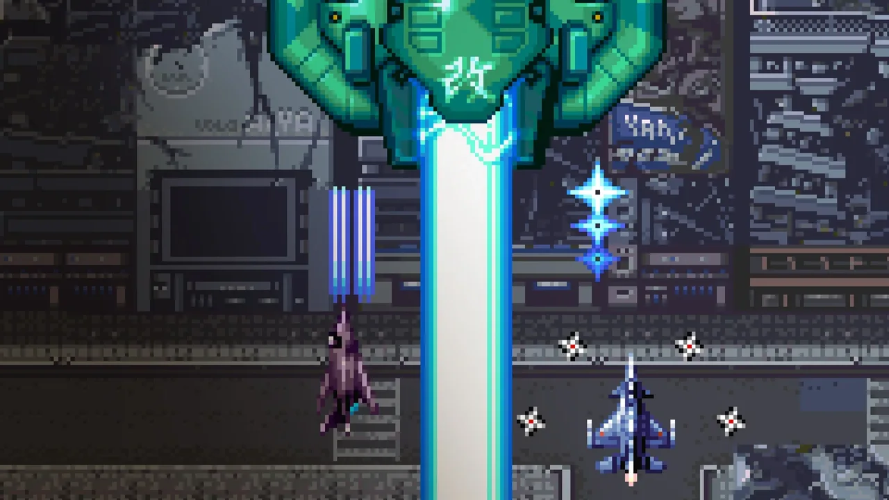 The game is played with two buttons, with the A button firing projectiles from the plane and the B button launching a special bomb attack which uses a bomb from a limited stock of bombs. Power projectiles can be obtained by destroying buildings and armored enemy planes. There are two types of Power projectiles: "P" Power projectiles, that increases the plane's firepower by one level, and "F" Power projectiles, that increases the plane's firepower to the maximum level instantly. The maximum level only lasts for a limited amount of shots. When certain ground enemies and buildings are destroyed, money bonuses appear which give a random amount of points each. When the player reaches the end of the stage, the player has to face a boss ship.