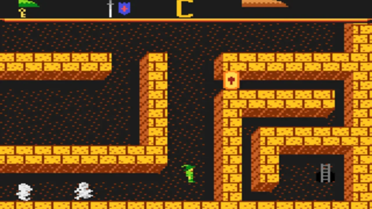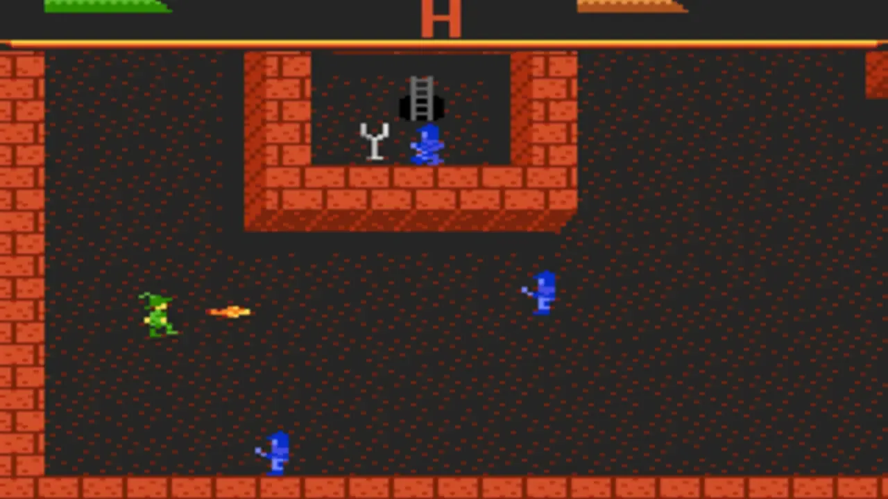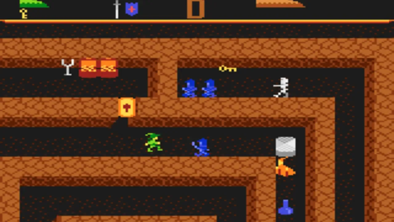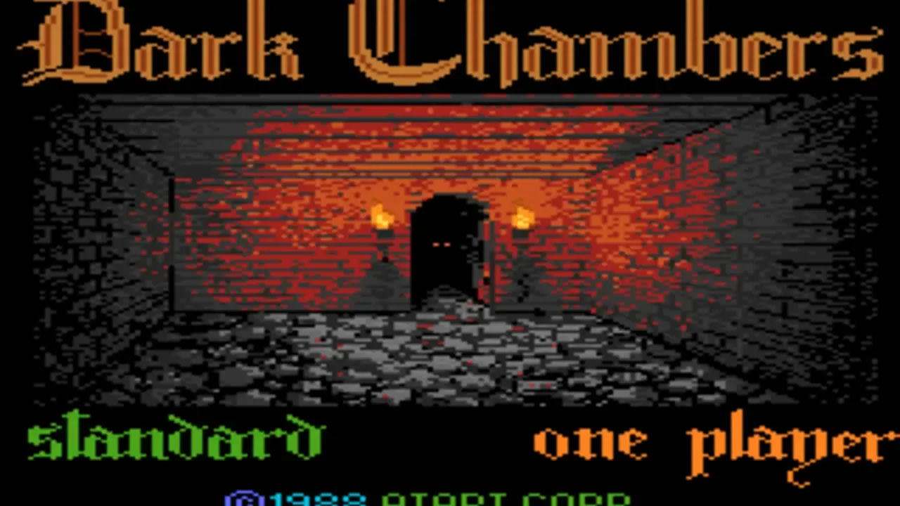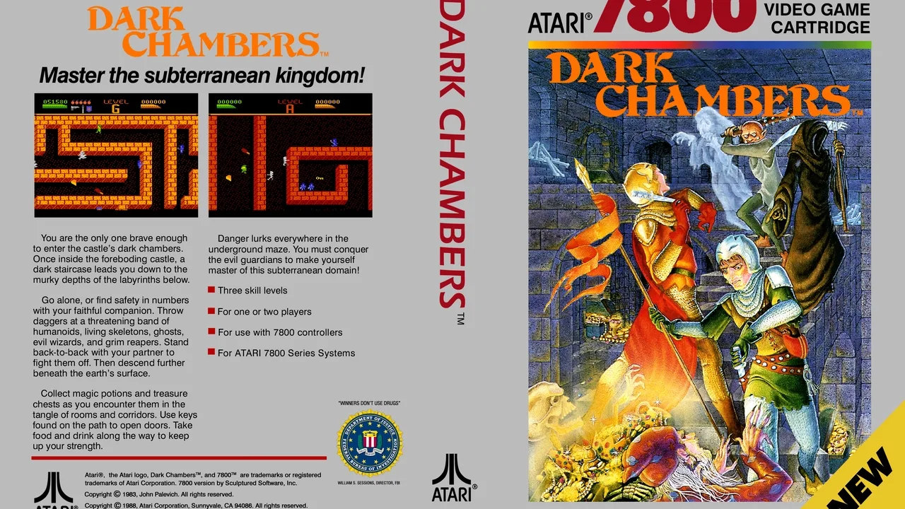 Dark Chambers is an arcade action game similar to Gauntlet. You are an explorer in an underground maze; your goal is to survive the 26 different levels and collect as many of the hidden treasures as you can. Hidden somewhere in each of the levels is an exit which will take you on to the next level. Trying to stop you from completing your quest are a wide variety of creatures, including zombies, wraiths, skeletons, wizards, and the grim reaper. Each of the creatures in the game has a different strength; when you shoot a creature, it will transform into the next weaker creature. Eventually a creature will become the weakest one (a zombie) at which point it can be destroyed. In addition to the creatures and treasures, other items that can be found in the maze are keys (to open doors), potions (to restore health), poison (drains health), guns (increases your firing rate), traps, shields, and bombs. The game is played from an overhead point of view, and is for one player or two players simultaneously.