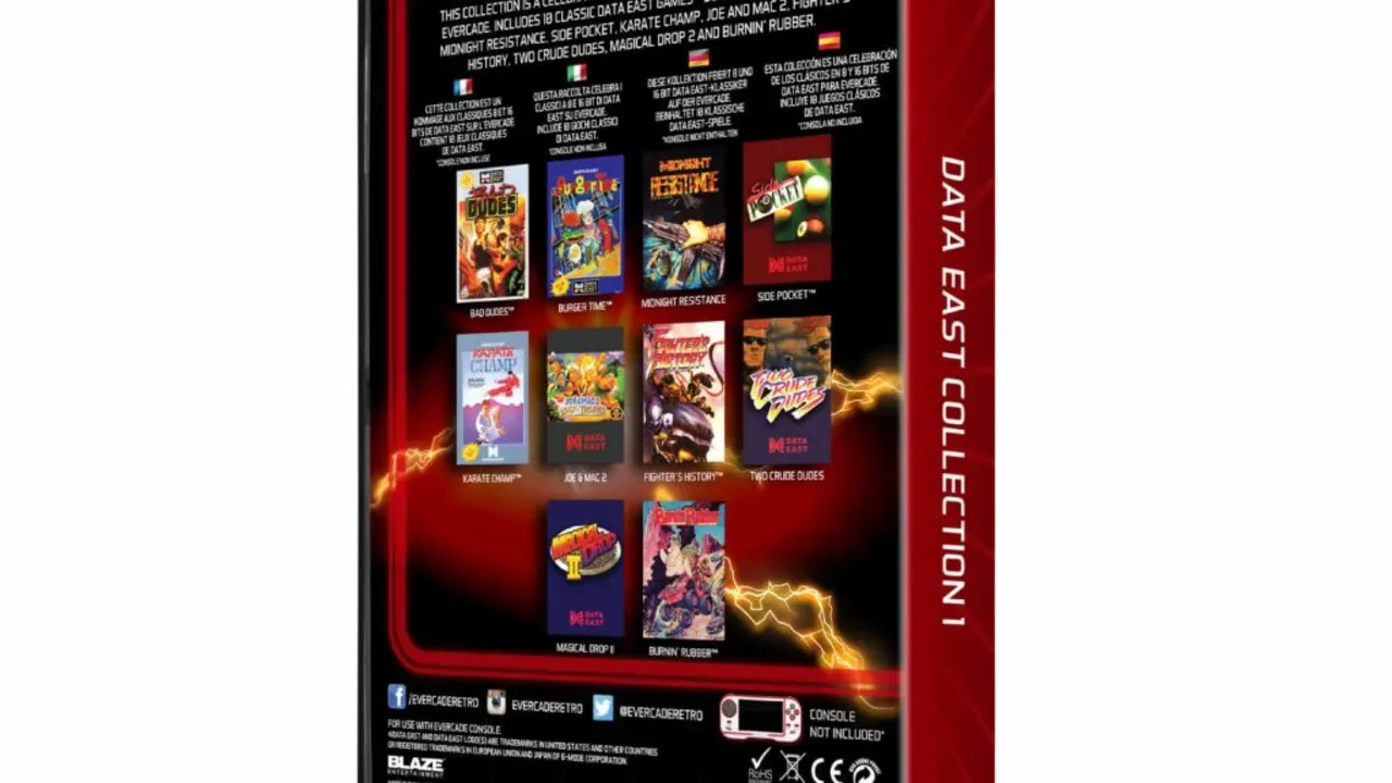 Data East Collection 1 is the first compilation of classic Data East games for the Evercade. It contains 10 classic games. Games included: - Burger Time - Fighter's History - Midnight Resistance - Burnin’ Rubber (Bump 'N' Jump) - Karate Champ - Joe & Mac 2: Lost in the tropics - Side Pocket (Mega Drive version) - Magical Drop 2 - Two Crude Dudes (known as Crude Buster in Japan) - Bad Dudes