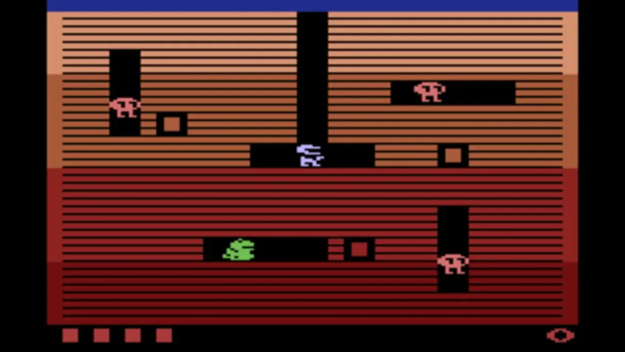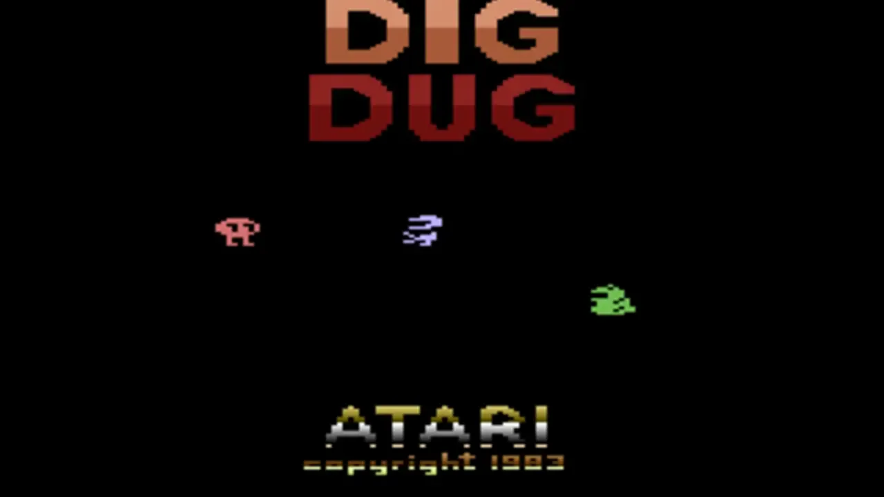 Dig Dug is a 1-2 player arcade game in which you have to use your shovel to dig your way through the earth. Stopping you from doing this are two monsters, called Pooka and Fygar, who will continually chase you around. The only weapon that you carry is an air pump, which you can use to inflate the monsters to the point where they explode. (if you start to inflate them but stop doing so, the monsters will get turned back to their normal selves). Furthermore, rocks are scattered throughout the earth, and you can use these rocks to squash them. If the monsters do not find you for several seconds, they will eventually get turned into ghosts, which are able to walk through the earth. They are invincible and cannot be killed. From time to time, vegetables will appear in the center, and you can get these for points.