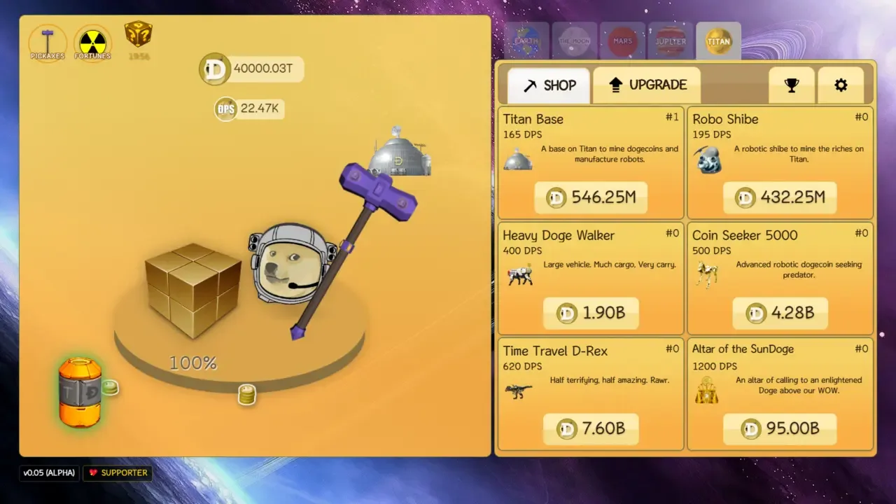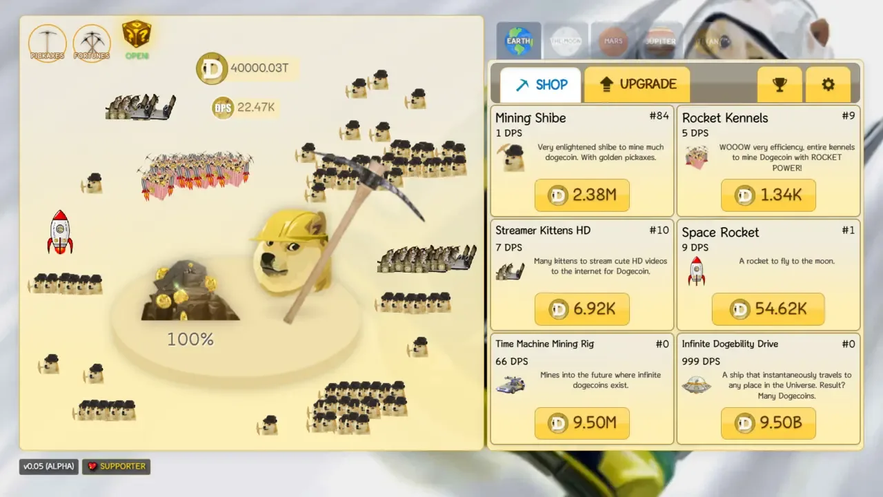 Dogeminer 2 is played by clicking a rock, earning one in-game Dogecoin per click. In-game Dogecoins can be used to hire helpers, which will automatically mine additional coins and increase the user's DPS (Dogecoins per second). Upgrades for the helpers may also be purchased to improve their efficiency.
