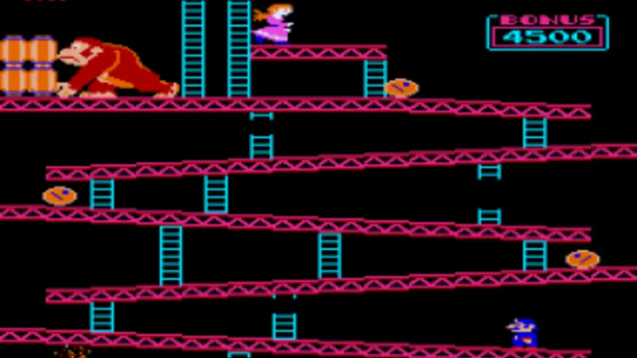 Donkey Kong is not only Nintendo's first real smash hit for the company, but marks the introduction for two of their most popular mascots: Mario (originally "Jumpman") and Donkey Kong. The game is a platform-action game that has Mario scale four different industrial themed levels (construction zone, cement factory, an elevator-themed level, and removing rivets from girders) in an attempt to save the damsel in distress, Pauline, from the big ape before the timer runs out. Donkey Kong is also notable for being one of the first complete narratives in video game form, told through simplistic cut scenes that advance the story.