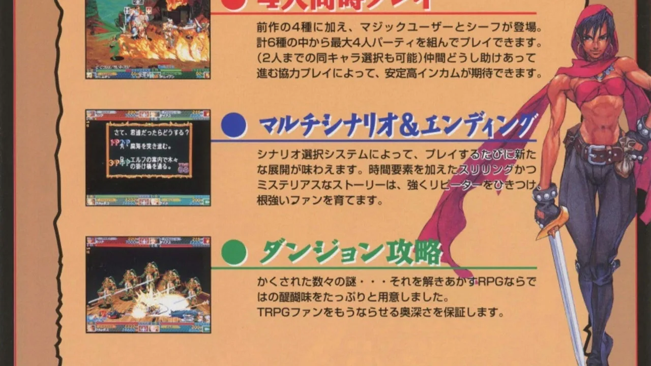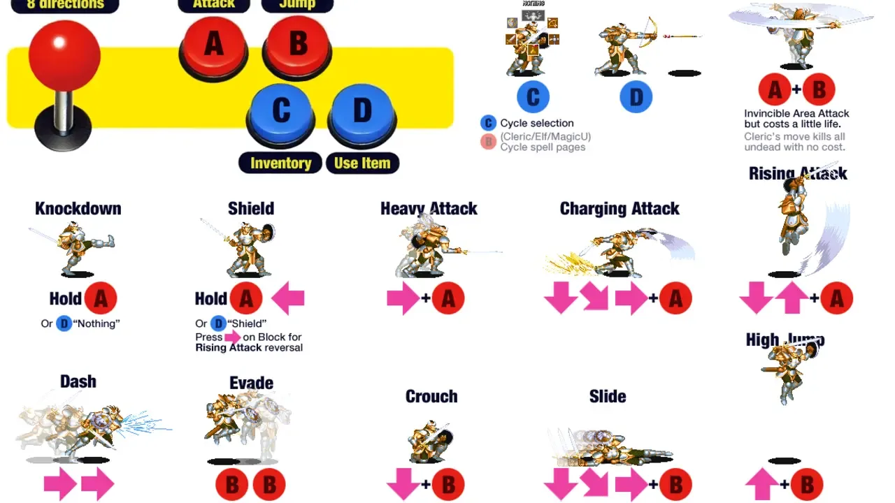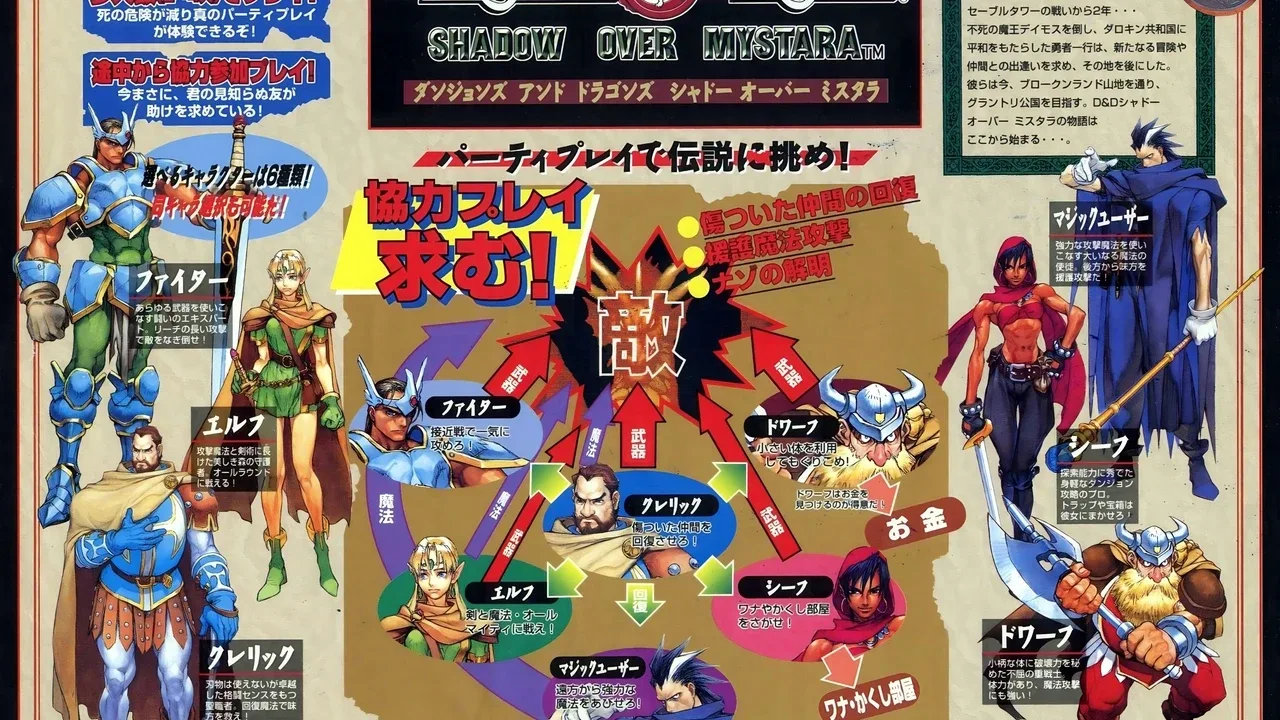 Shadow over Mystara is a side-scrolling beat-'em-up with role-play elements that make it stand out from other similar games released at the time. In addition to the original four heroes found in its predecessor, Dungeons & Dragons: Tower of Doom (Cleric, Dwarf, Elf and Fighter), Shadow of Mystara adds a Thief and a Magic-User to the selection. Furthermore, with the inclusion of two separate versions of each character's sprite set, the game allows up to two players to select the same character (in Tower of Doom each of the characters could only be selected once), effectively giving the game 12 "different" characters to choose from. The two Clerics and two Magic Users also have subtle differences within their spell books. The controls are using four buttons: Attack, Jump, Select (brings up a small inventory ring around the character allowing the player to choose what item is set in the Use slot) and Use. The Cleric, Elf and Magic-User also have two extra rings for their spells, with the Jump button used to switch from ring to ring. While the game uses the same kick harness as the previous game, the Select and Use buttons are reversed. Shadow over Mystara also introduced a selection of special moves which are executed by moving the joystick and tapping the buttons in certain combinations, in a way similar to the Street Fighter series. The characters (except for the Magic-User) have a Dashing Attack as well as a Rising Attack which can be used to combo monsters or even juggle them in the air. Most characters (again, with the exception of the Magic-User and also Cleric) also have a Megacrush, a move common to nearly all of Capcom side-scrollers, which damages all enemies standing close enough to the character but in turn also damaging the player themselves.