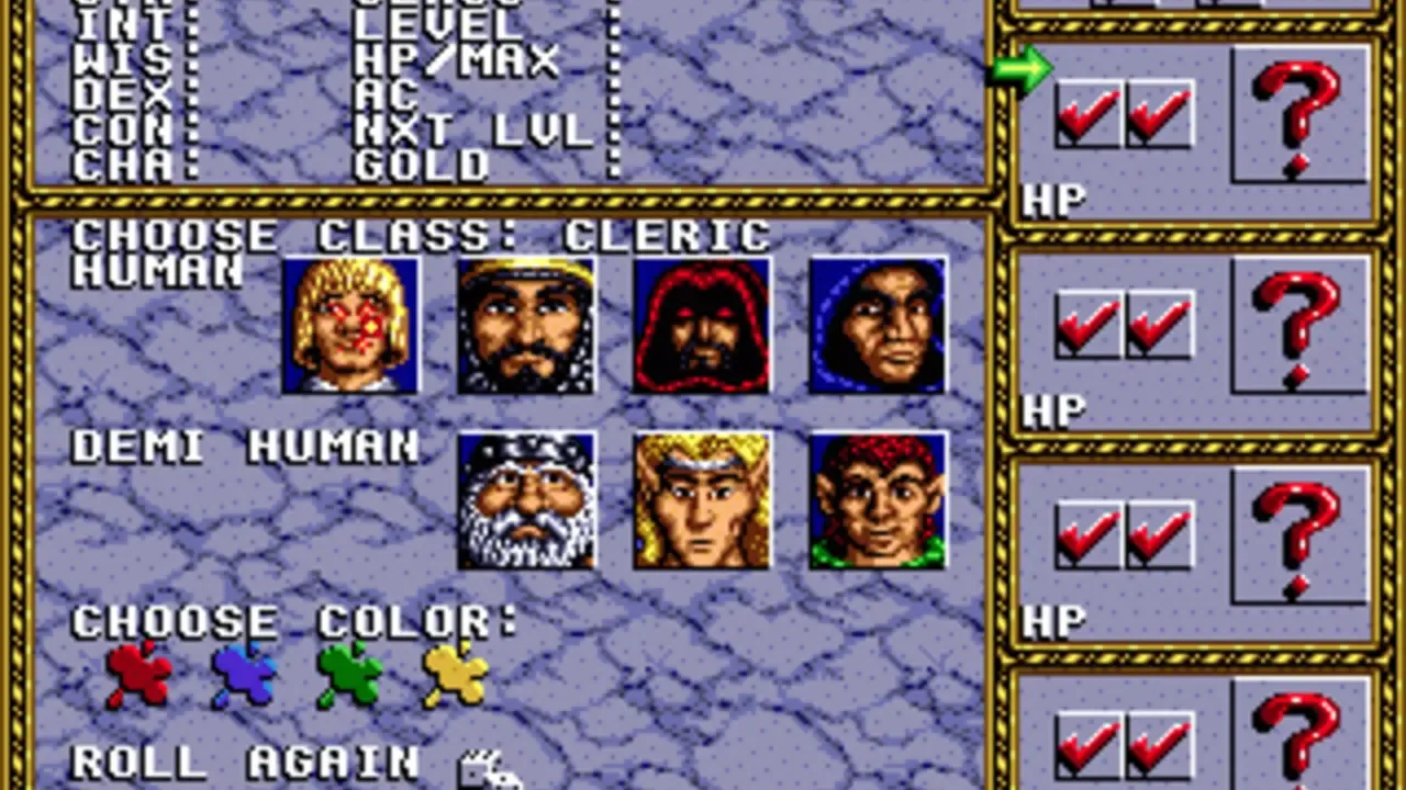 In addition to the original four heroes found in its predecessor, Dungeons & Dragons: Tower of Doom (Cleric, Dwarf, Elf and Fighter), Shadow of Mystara adds a Thief and a Magic-User to the selection. Furthermore, with the inclusion of two separate versions of each character's sprite set, the game allows up to two players to select the same character (in Tower of Doom each of the characters could only be selected once), effectively giving the game 12 "different" characters to choose from. The two Clerics and two Magic Users also have subtle differences within their spell books. The controls are using four buttons: Attack, Jump, Select (brings up a small inventory ring around the character allowing the player to choose what item is set in the Use slot) and Use. The Cleric, Elf and Magic-User also have two extra rings for their spells, with the Jump button used to switch from ring to ring. While the game uses the same kick harness as the previous game, the Select and Use buttons are reversed. Shadow over Mystara also introduced a selection of special moves which are executed by moving the joystick and tapping the buttons in certain combinations, in a way similar to the Street Fighter series. The characters (except for the Magic-User) have a Dashing Attack as well as a Rising Attack which can be used to combo monsters or even juggle them in the air. Most characters (again, with the exception of the Magic-User and also Cleric) also have a Megacrush, a move common to nearly all of Capcom side-scrollers, which damages all enemies standing close enough to the character but in turn also damaging the player themselves.
