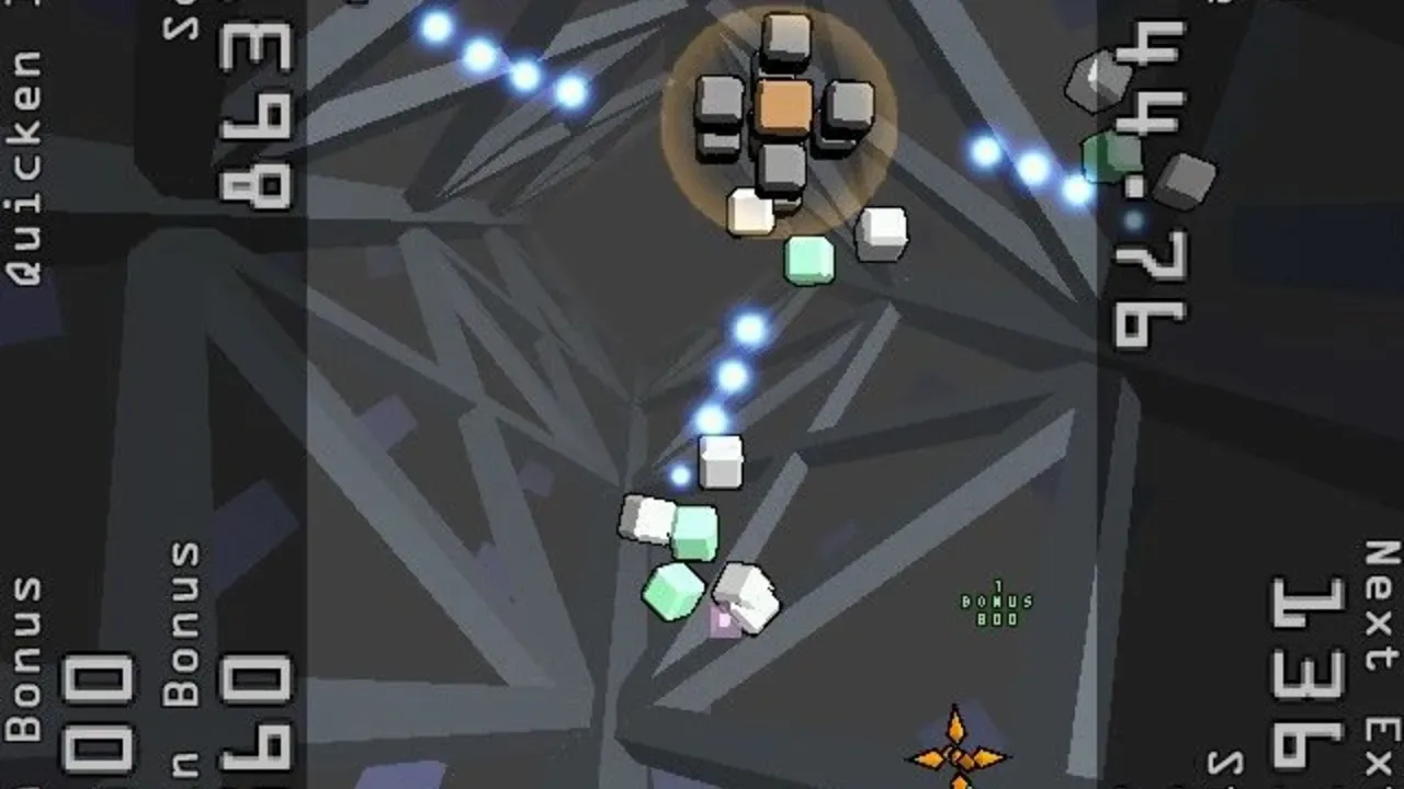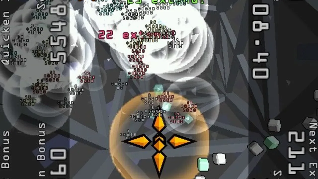 In Every Extend, players control a ship with the only ability to detonate itself. Stages begin with a set time limit and enemies appearing on screen in randomized patterns. When the player detonates their ship and an enemy is caught in its blast radius, the enemy will explode and have its own blast radius that other enemies can get caught in, causing a chain reaction. Every Extend Extra is a redevelopment of the popular freeware game Every Extend, which was a personal project by Kanta Matsuhisa under her "Omega" pseudonym.