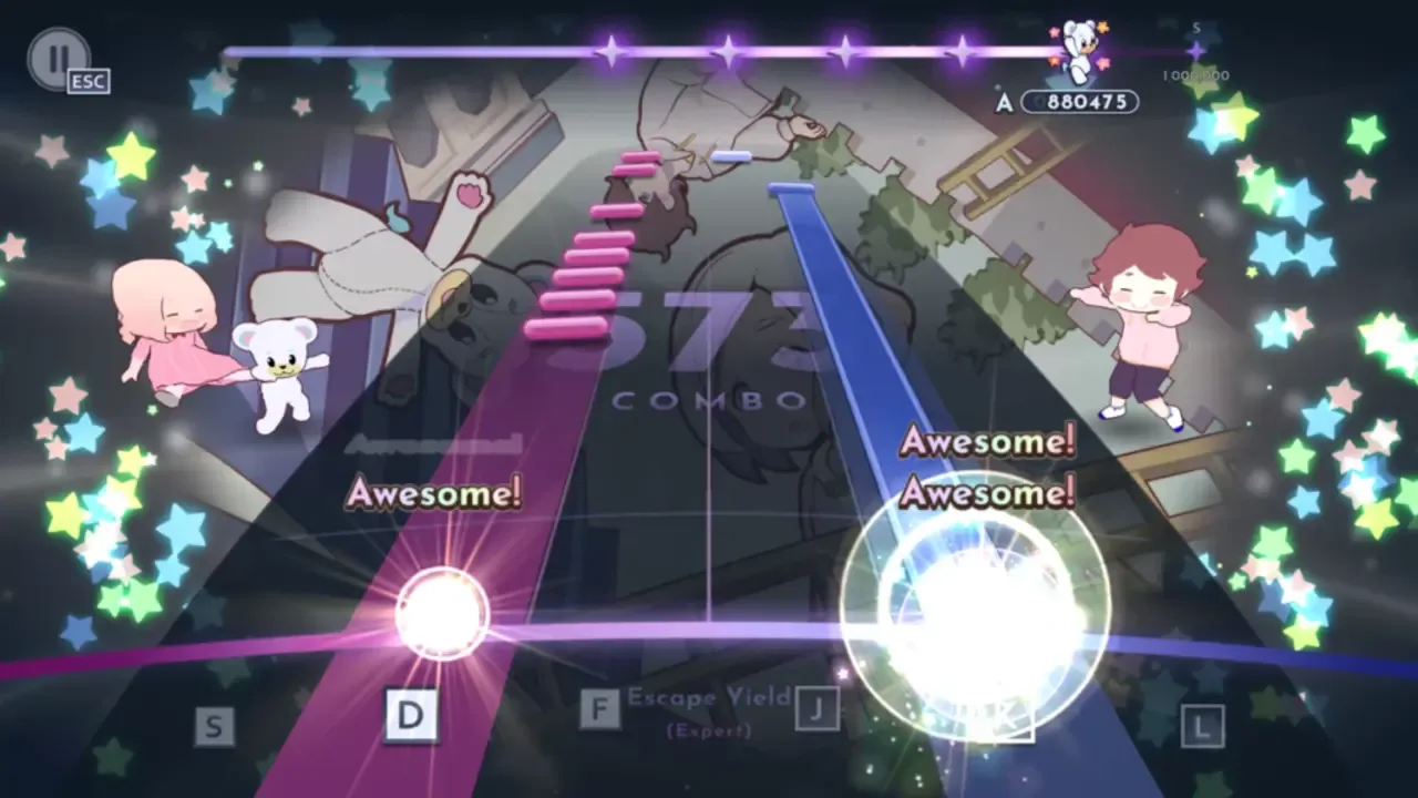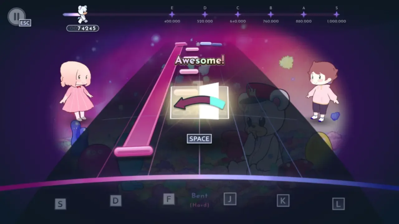 VoltRhythm is a retro-futuristic four-key rhythm game where rhythm play generates power. Accurate rhythm play emits a large amount of "rhythm energy," which can be converted to usable electricity with surprising efficiency. Your goal is to fill the energy reserves by playing as many songs as possible with as much accuracy as possible. Though, what is the reason for gathering this much energy...?