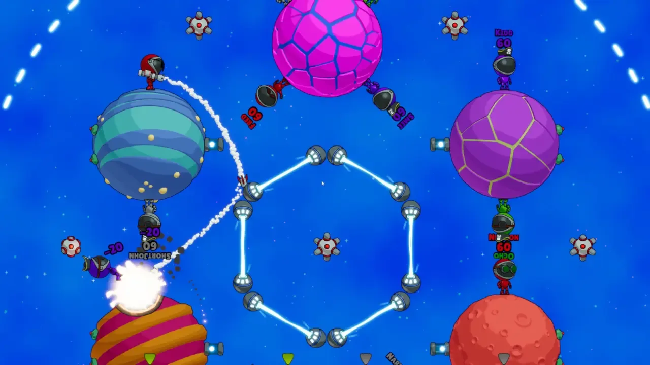 A turn-based combat game made in Flash where players take control of feuding astronauts with an arsenal of different weapons. Players can directly shoot opposing astronauts to deplete their health points, or if shot at the right angle with an explosive, can send them flying into space or hurtling into the sun. The planets are destructible and projectiles are affected by gravity, meaning you can make shots weave around multiple planets. Players can upgrade their astronauts with more health and a longer target predictor or upgrade weapon ammo. This is the offline predecessor of Gravitee Wars Online.