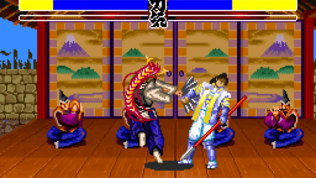 Hana no Keiji: Kumo no Kanata ni is a weapon-based versus fighting game based on the manga of the same title (created by Tetsuo Hara). There are two playable modes, in one you can follow the manga story, while in other you can fight against the computer or player two. There are eight different characters and scenarios to choose from. When following the manga story, there are different paths depending on the choice that the player makes. The most significant thing about the versus battle is that the characters can lose their weapons as much as recover them. Also, a special trick can be executed when the player has enough energy.