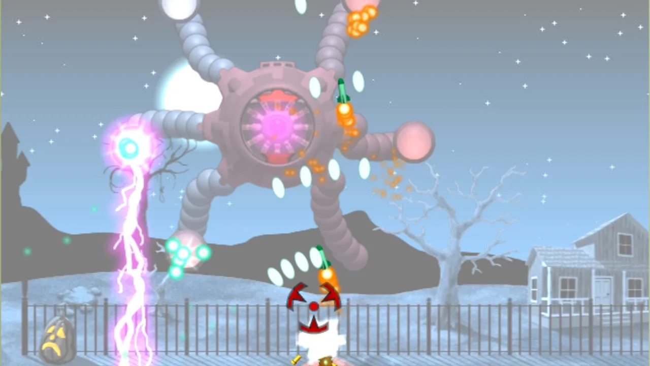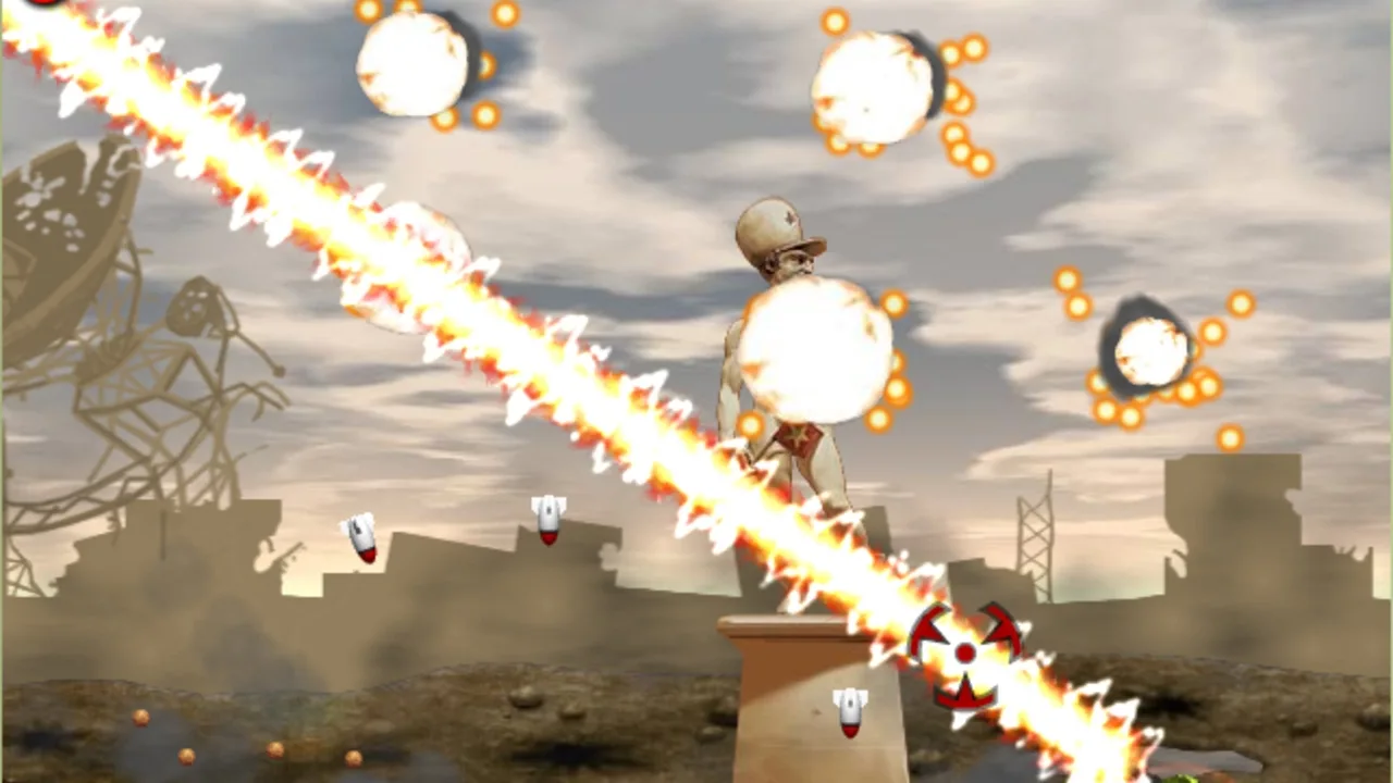 Heavy Weapon is a cartoonish side-scrolling action game where you control a single tank fighting waves of opponents. Driving to the right over flat terrain at a constant speed, the tank can move left or right while the sky is filled with aircraft such as jets, helicopters, zeppelins, bombers, and missiles. Projectiles need to be avoided or taken out. Some friendly planes will pass and drop power-ups to improve speed, gun power or shield, or provide nukes, rockets, a laser, rapid-fire, or spread fire. During each level, enemies will drop parts of a mega laser weapon. If the four parts are found, an extremely powerful laser beam is added to your arsenal for a short time.