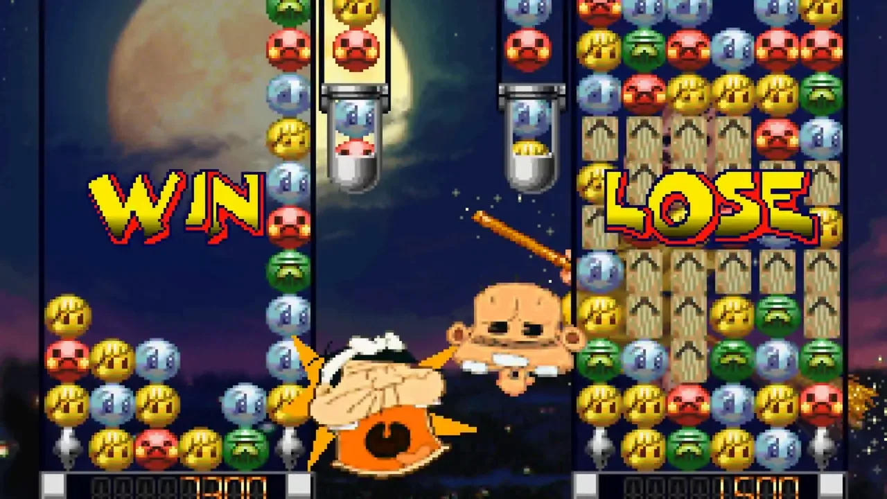 Heisei Tensai Bakabon: Susume! Bakabons is a competitive falling-block puzzle game based on the 1990 animated series Heisei Tensai Bakabon. Pairs of blocks in four colors drop from the top of the screen, and the goal is to line up two or more blocks of the same color, with another pair of a different matching color at either end. Any blocks on top of the ones cleared will fall into the open space, potentially comboing together into chains. Clearing multiple sets of blocks in a combo or chain will send garbage blocks to the opponent's playfield, and also charge up a super move that triggers automatically at a certain threshold which can clear a large number of blocks from the playfield. The game has a single-player story mode in which Bakabon's dad, refusing to wake up in the morning, gets sucked up by his wife's vacuum cleaner and sent to a strange puzzle world where he must defeat the other characters from the show in puzzle battles. There is also a two-player versus mode with nine playable characters.