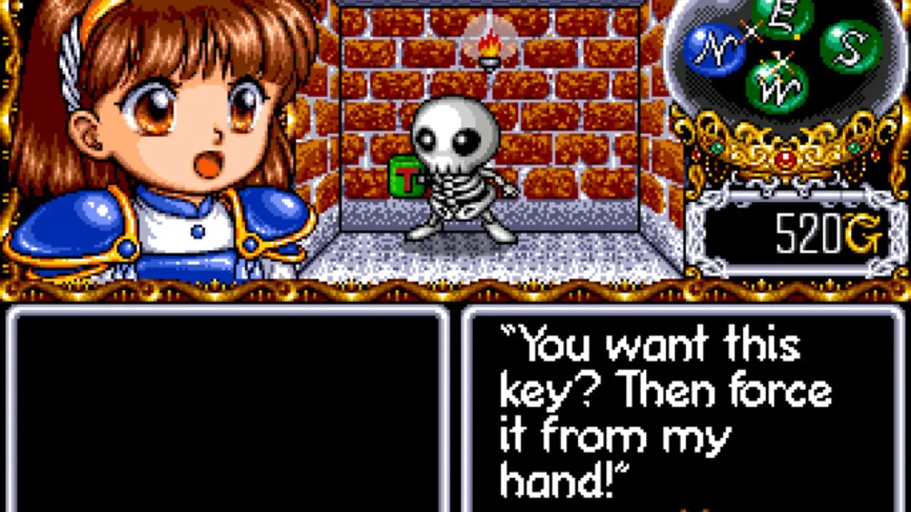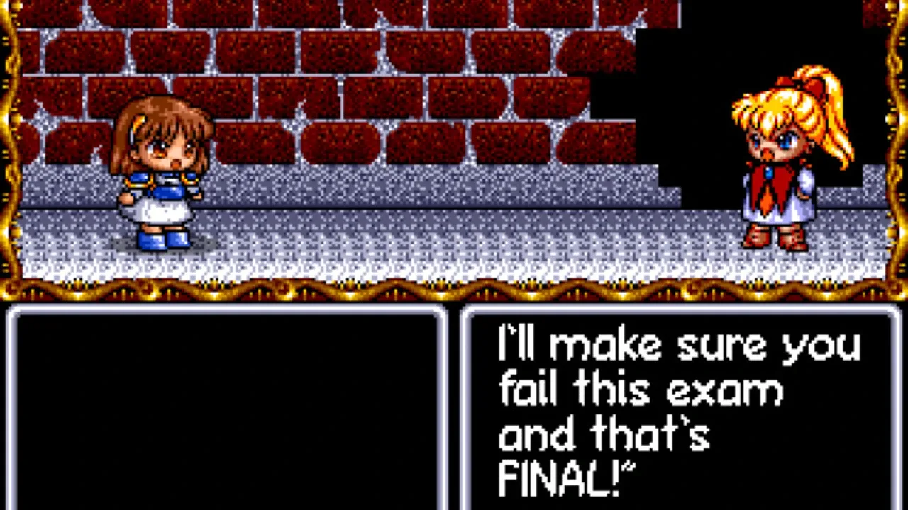 Madou Monogatari is a first-person dungeon-crawler developed by AIKY that released on December 14, 2005 for DoCoMo's i-mode branded mobile phones and was available through G-mode's R.P.G-mode service, which required a monthly fee of 300 yen to access various RPG games. It is the last Madou Monogatari entry to feature the original cast of characters created by Compile. The game was only available to download for six months before being delisted sometime in June 2006, and as of November 30, 2021, the game can no longer be launched due to G-mode's service through i-mode being discontinued. Unlike Madou Monogatari (Saturn), Madou Monogatari returns to the classic first-person dungeon crawling style. A new spell, Stone, is introduced that attacks enemies with falling stones, and after clearing the game you'll be presented with a report card that changes depending on the amount of steps Arle takes, the amount of damage done to enemies, and the number of times that curry is eaten.