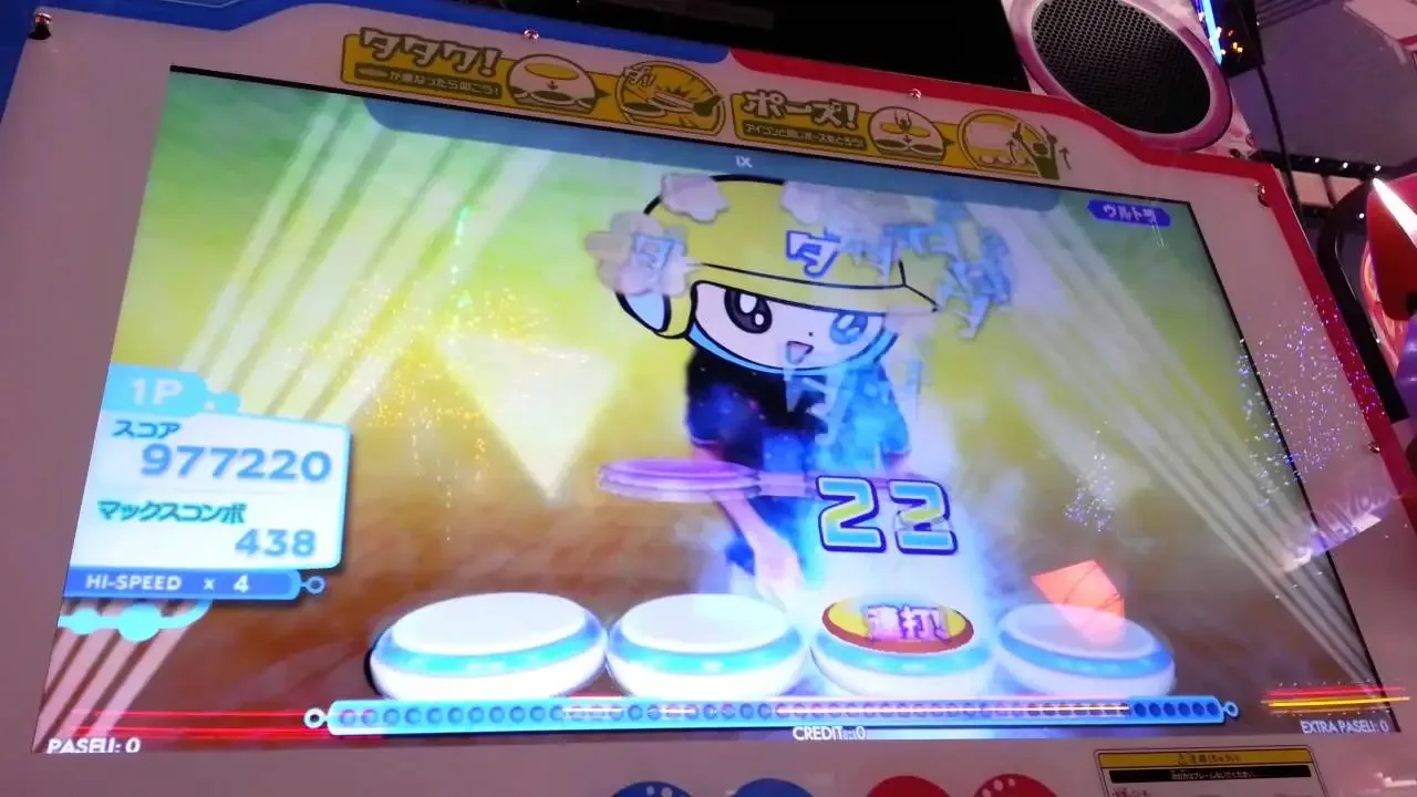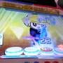 Mirai Dagakki FutureTomTom is a short lived drumming game from Konami in their BEMANI franchise. The cabinet consists of 4 tom-tom drums in a row where one or two players play in time with falling objects in the screen. The game features a couples mode where notes are placed in such a way that you often end up hugging the other player (with one player playing the inner two drums while the other having the outer two drums), in this mode you are scored not only on how well you were doing, but your compatibility. The game makes use of a kinect camera to show you drumming in the background of the game, as well as creating a collage of your performance that you can retrieve from the eAmuse app at the end of the game. The camera is also used for special gesture commands in some songs.
