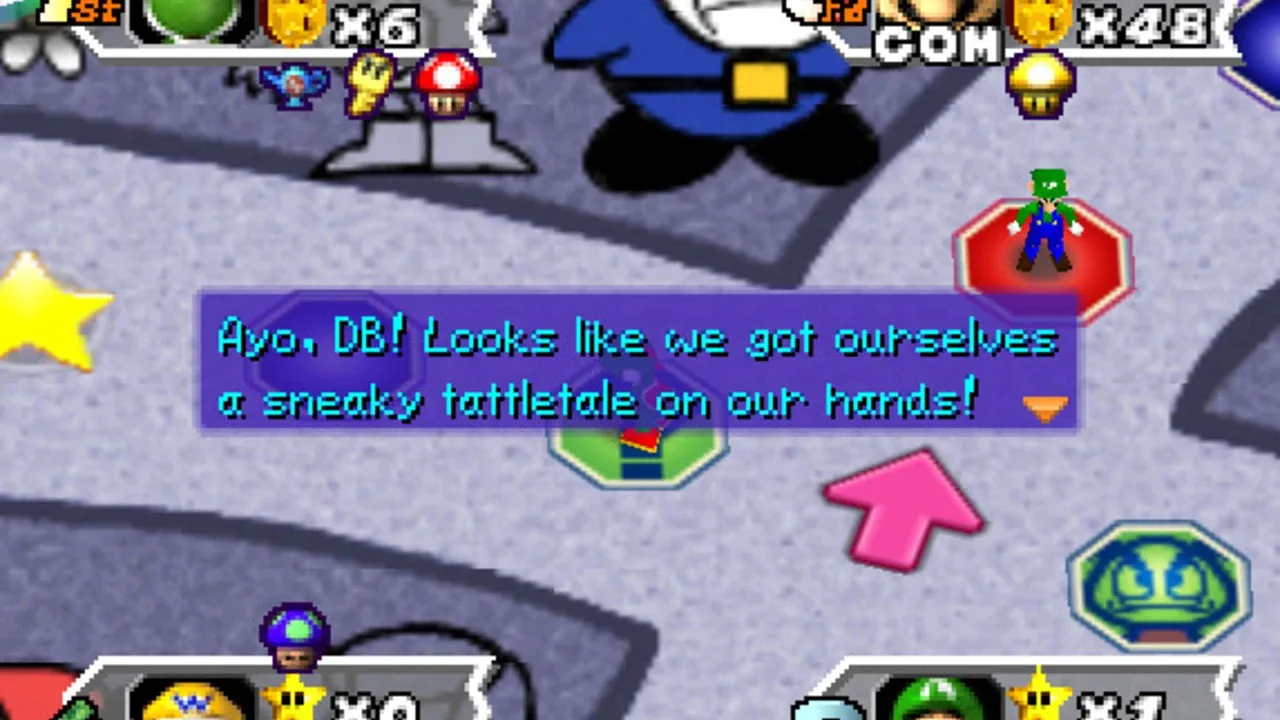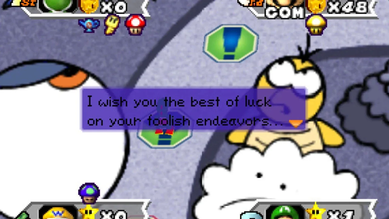 Mario Party 3 is the third and final Mario Party title for the Nintendo 64. A total of eight characters are available to choose from: Mario, Luigi, Princess Peach, Yoshi, Wario, Donkey Kong, and newcomers Waluigi and Princess Daisy. Mario Party 3 features duel maps, in which two players try to lower each other's stamina to zero using non-playable characters such as Chain Chomps. It is the first Mario Party game to feature Luigi's main voice and also it is last Mario game where Princess Daisy appears in a yellow and white dress, and with long hair, as well as the last Mario game (until New Super Mario Bros. Wii) in which Yoshi's "record-scratching" voice is used. It is also the first Mario Party game to have multiple save slots.