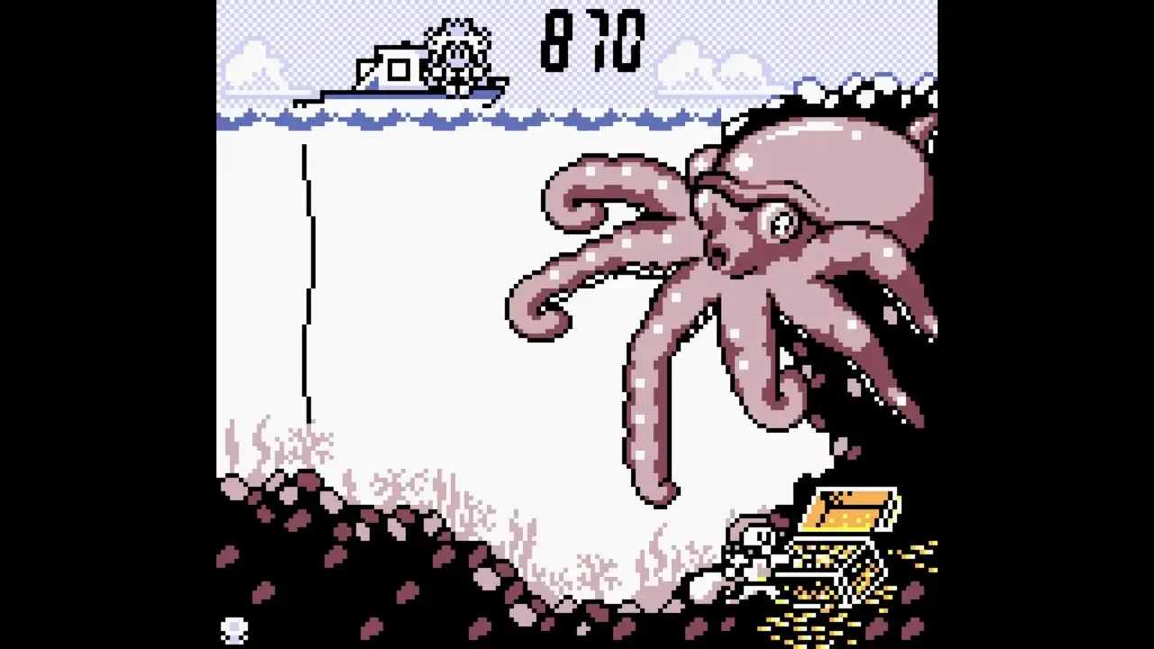 Octopus is a Game & Watch game that was released on the G&W widescreen series. In the game, you, the diver, must get around an octopus whom is trying to capture you and get to the treasure. When Mr. Game & Watch returns to the salvage ship, he gets three extra points. The player's three chances are measured by extra divers on the savage ship. When one is attacked by the Octopus' tentacles, another takes his place.