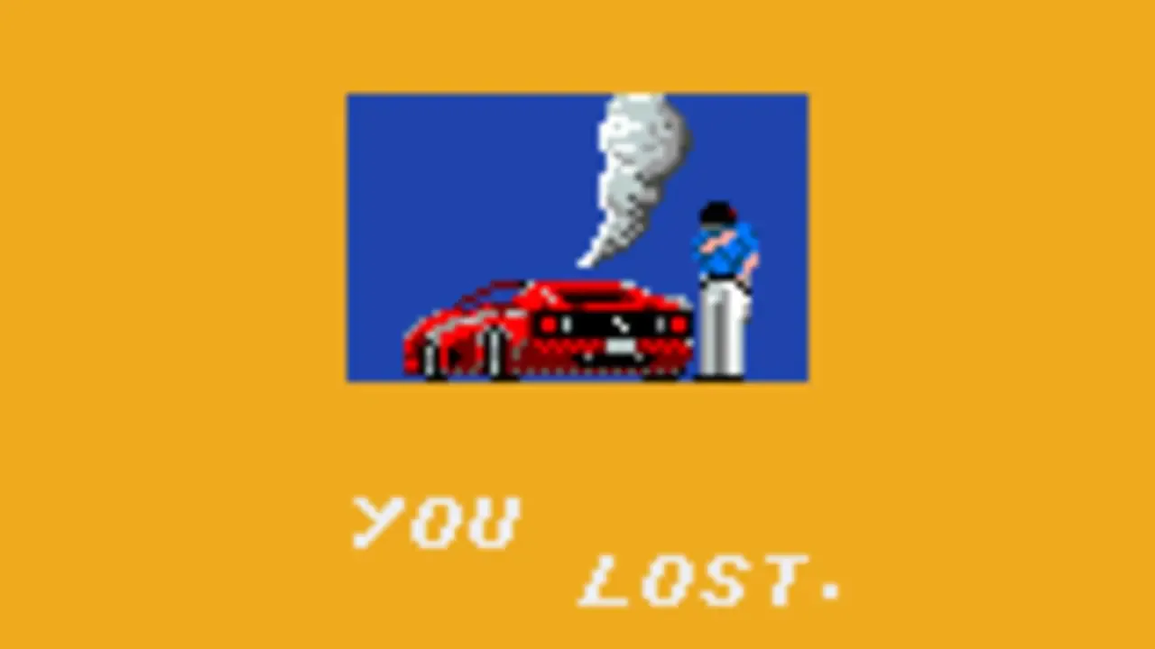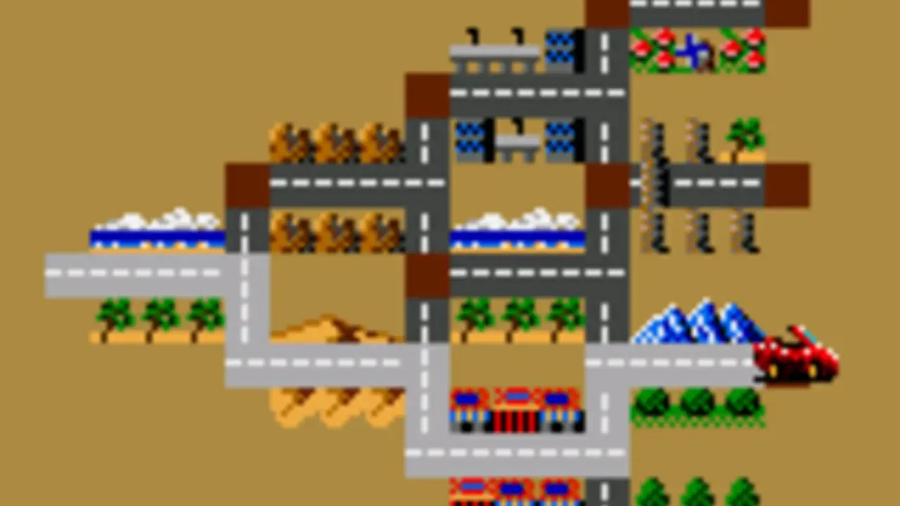OutRun is a racing game originating in the arcades. The player can race across varied terrain in a readily available Ferrari, complete with a female passenger, over a series of short tracks. Gameplay is viewed form just above and behind the car. The roads are full of sharp bends and hazards, contact with which can cause the car to roll and lose the player's time. On each section of track there is a fork in the road, allowing the player to choose which direction he or she wishes to go in. The player has to to complete five track sections in total, out of the fifteen in the game.