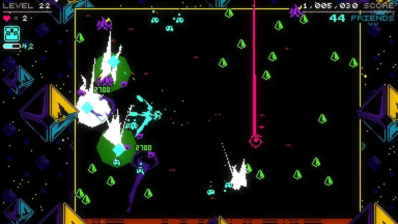 A chaotic, infinite twin stick shooty.