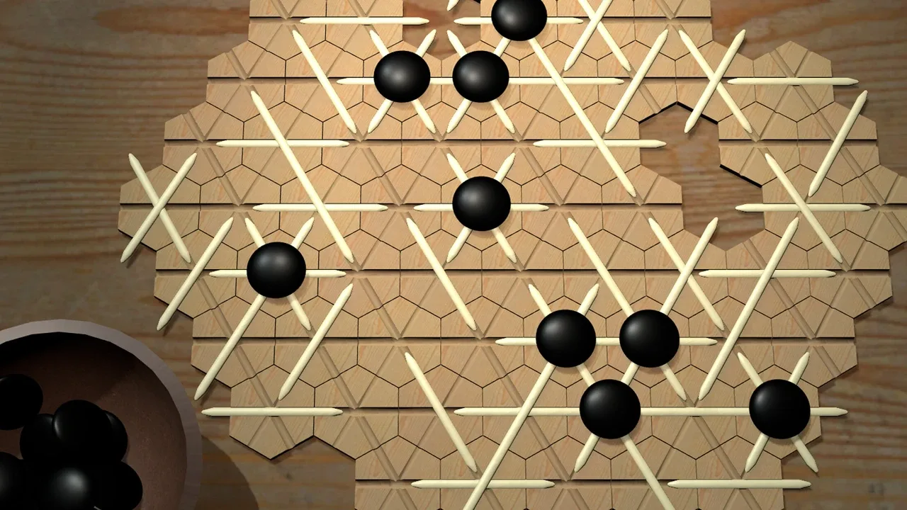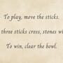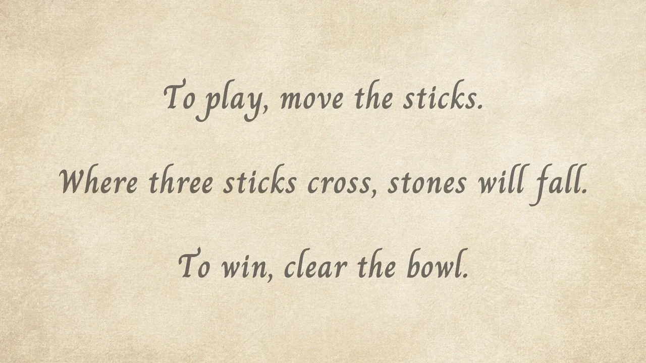 To play, move the sticks. Where three sticks cross, stones will fall. To win, clear the bowl.