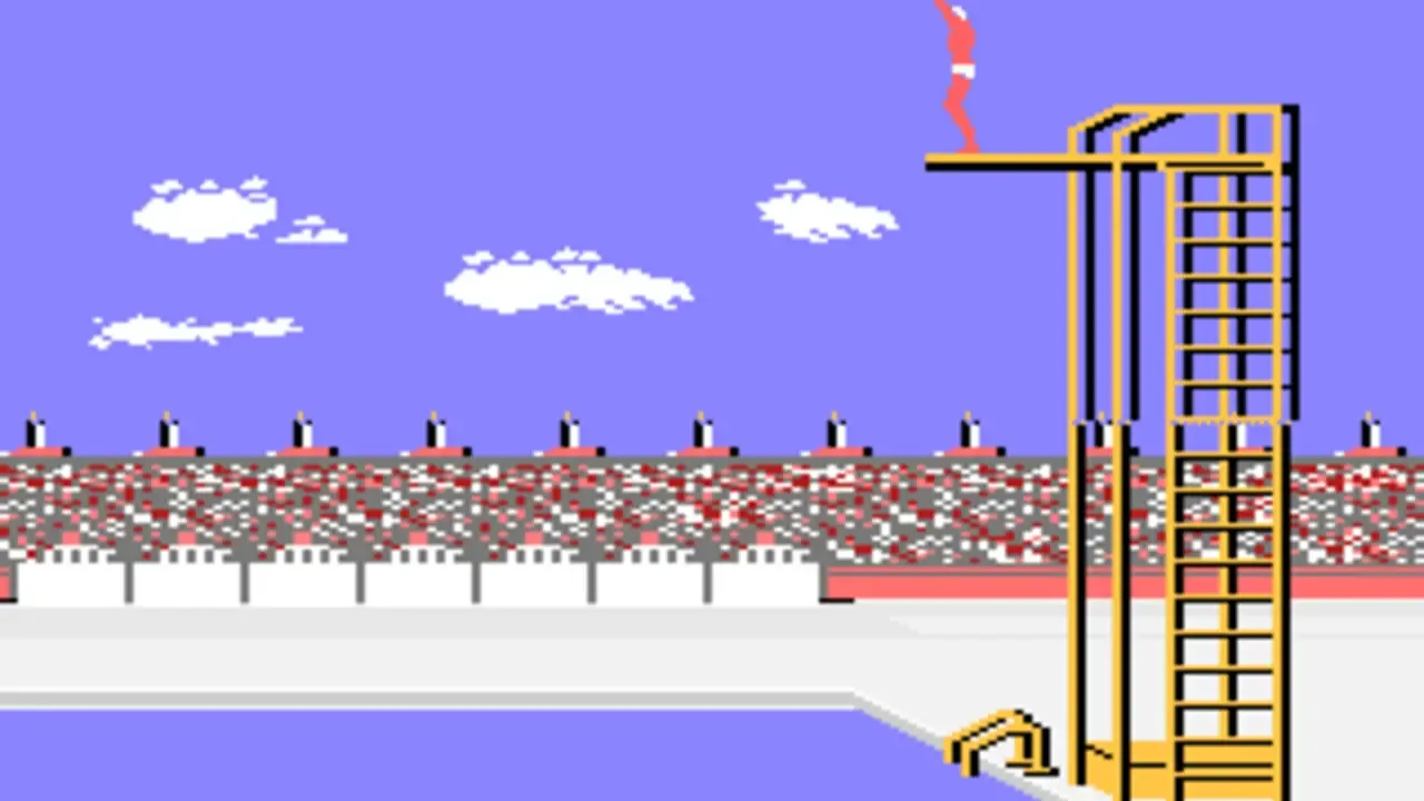 Summer Games allows up to eight players to compete in a series of summer themed Olympic events. The gameplay is similar to the other entries in Epyx "games" series. Each player can choose a country to represent, and then takes turns competing in various events to see who will win the gold medal! The game allows you to compete in all of the events sequentially, choose a few events, choose just one event, or practice an event. The events available vary slightly depending on the platform, and may include: - Pole vault - Platform diving - 4x400 meter relay - 100 meter dash - Gymnastics - Freestyle swimming - Skeet shooting - 100 meter freestyle - Rowing