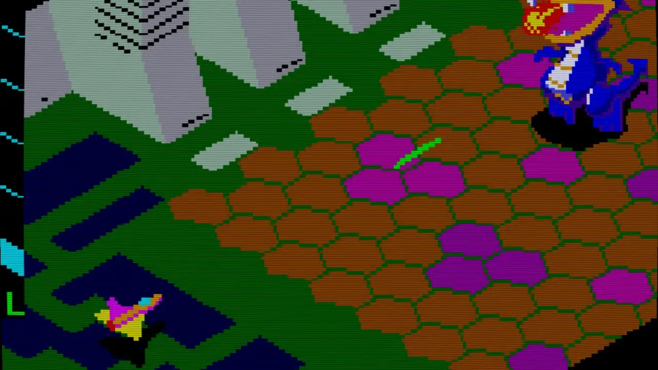 Challenger is a frantic single-screen shoot 'em up. The player is in their craft at the bottom of the screen, shooting bursts of three shots at 45 degree angles at flashing polygons. When hit, the polygons split into smaller ones. Your task is interrupted by incoming squiggly lines which will destroy your ship unless you hit it before it reaches the floor. Furthermore, a walking car or robot creature sometimes enter the screen, giving you bonus points if you locate your ship below it. As a safety measure, you have a smart bomb that damages everything onscreen, as well as the ability to change sides to the top of the screen if it gets too crowded at the bottom.