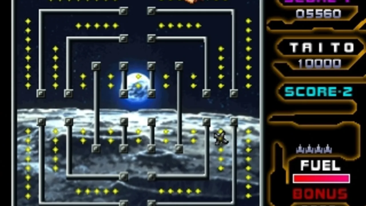 Space Chaser was an arcade machine made by Taito in the year 1979 which is comprised of 3 boards. Space Chaser was a 2-Dimensional maze racing game. You control your rocket through the maze to pick up the dots while at the same time avoiding the rocket, or rockets, that are constantly trying to ram you. Successfully get through one maze and many more await you. This is good practice for freeway driving in the big city.