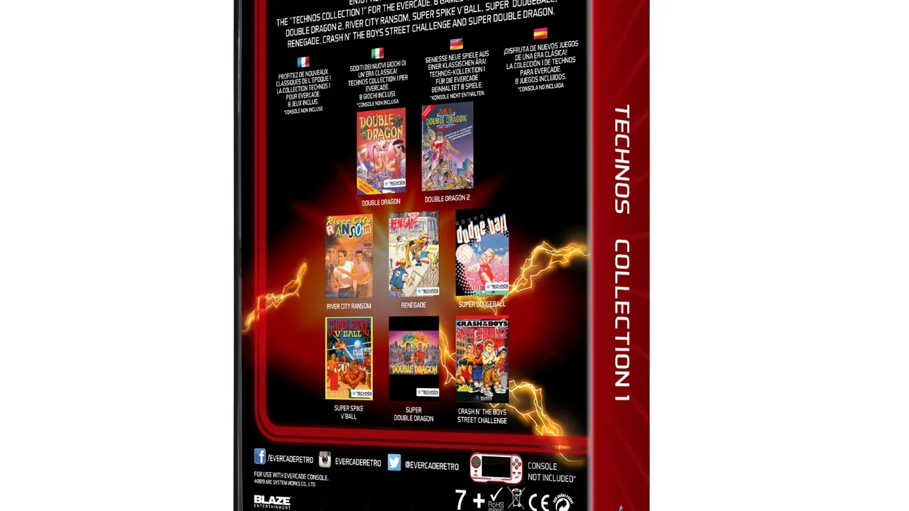 Technos Collection 1 is an Evercade compilation cartridge which contains classic games developed by ArcSystem Works and Blaze Entertainment. Games included: - Double Dragon - Double Dragon II: The Revenge - Crash 'N' The Boys: Street Challenge - River City Ransom - Super Dodge Ball - Super Spike V’ball - Super Double Dragon - Renegade