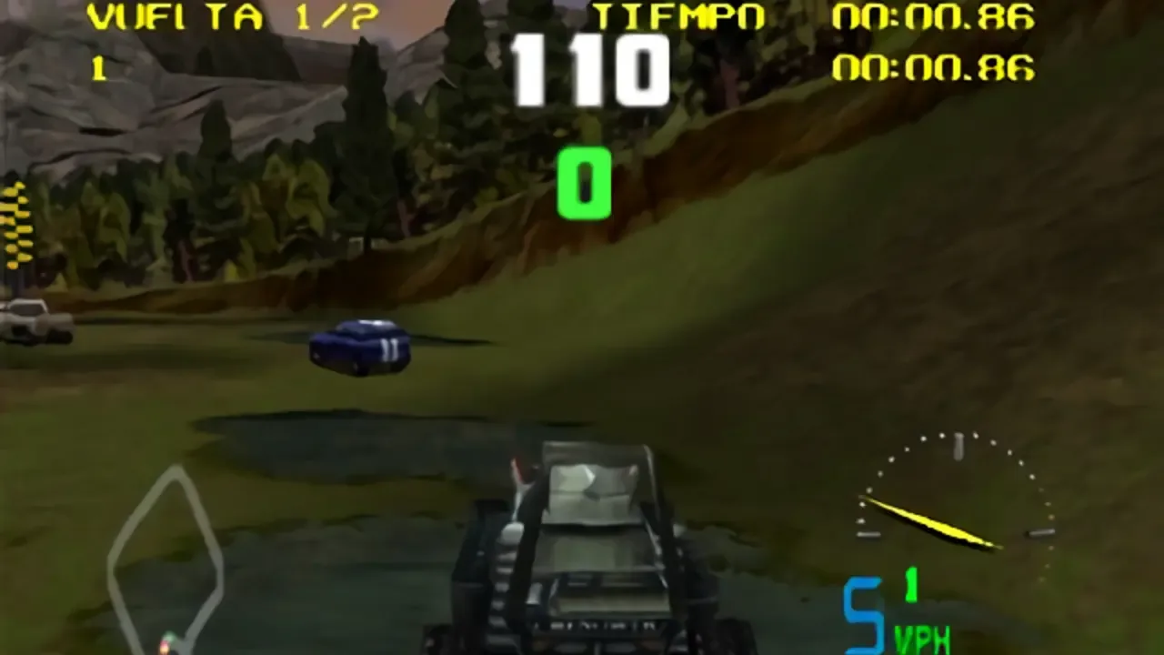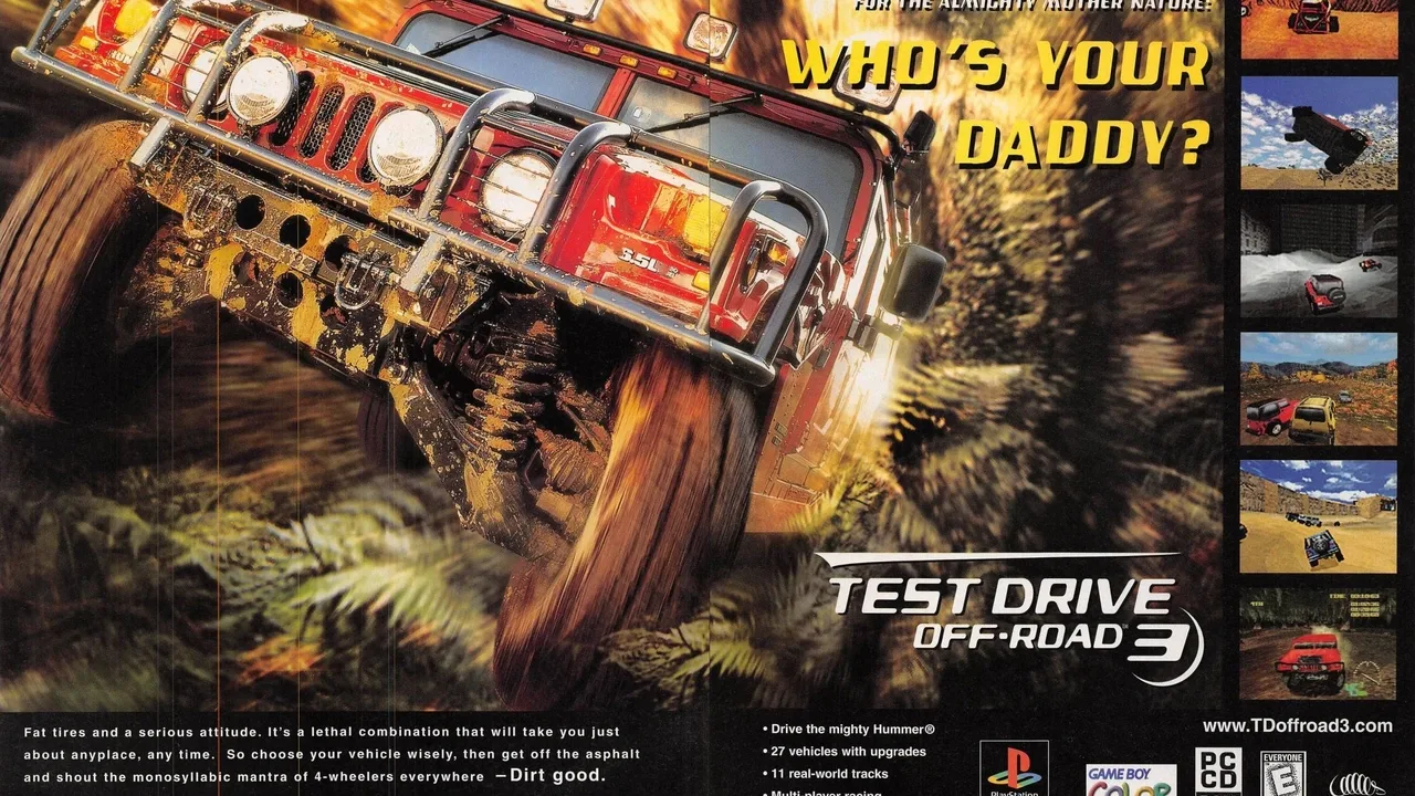 It's time to wander off the beaten path with Test Drive Off-Road, the first off-road racing game in the popular driving series. Players can hit the road with one of four licensed 4x4 vehicles, each rated in speed, handling and acceleration: a Hummer, Land Rover Defender 90, Jeep Wrangler and Chevrolet K-1500 Z71. Once you select a vehicle, you'll be able to choose from four color schemes, enter your name and compete in a Mixed League or Class League. Depending on the league, you'll race against other vehicles of the same class or challenge all classes for one of six different cups. Nine camera angles let you change perspectives on-the-fly, including a dashboard view complete with a moving steering wheel! There are twelve 3D tracks in total, covering such terrain as dirt, snow, sand and rocks: County Road, Jump Jet, Sand Speedway, Ridge Runner, Devil's Elbow, Winter Wonderland, Dirt Dash, Pharaoh's Curse, Sand Trap, Under Construction, Snowball Express and Pipeline Way. A Practice mode will let you learn the ins-and-outs of these courses once you open them up within competition.