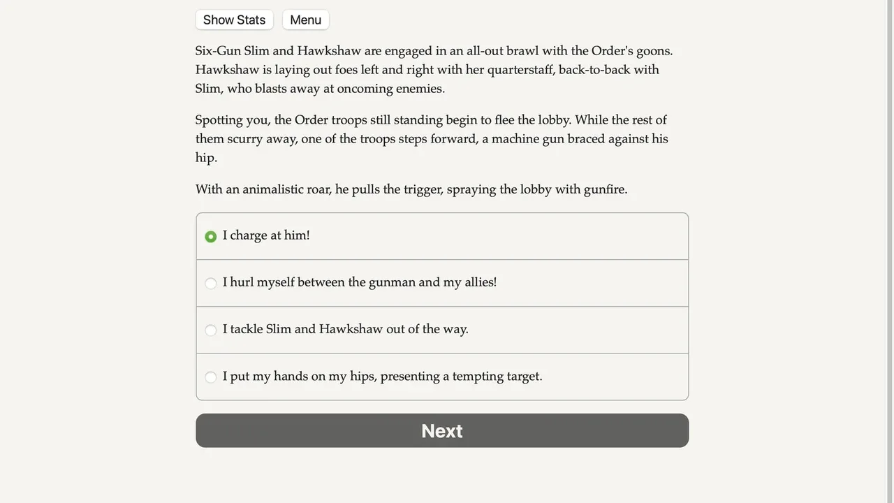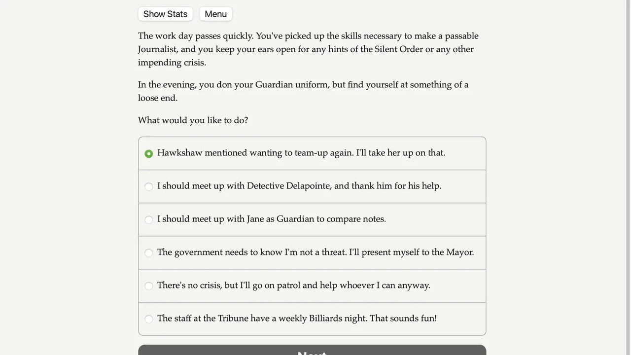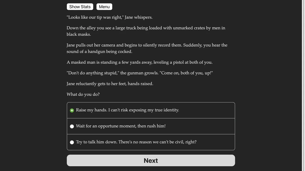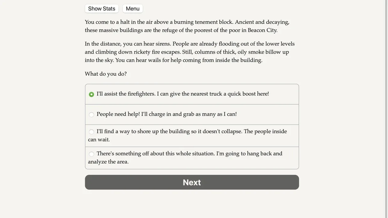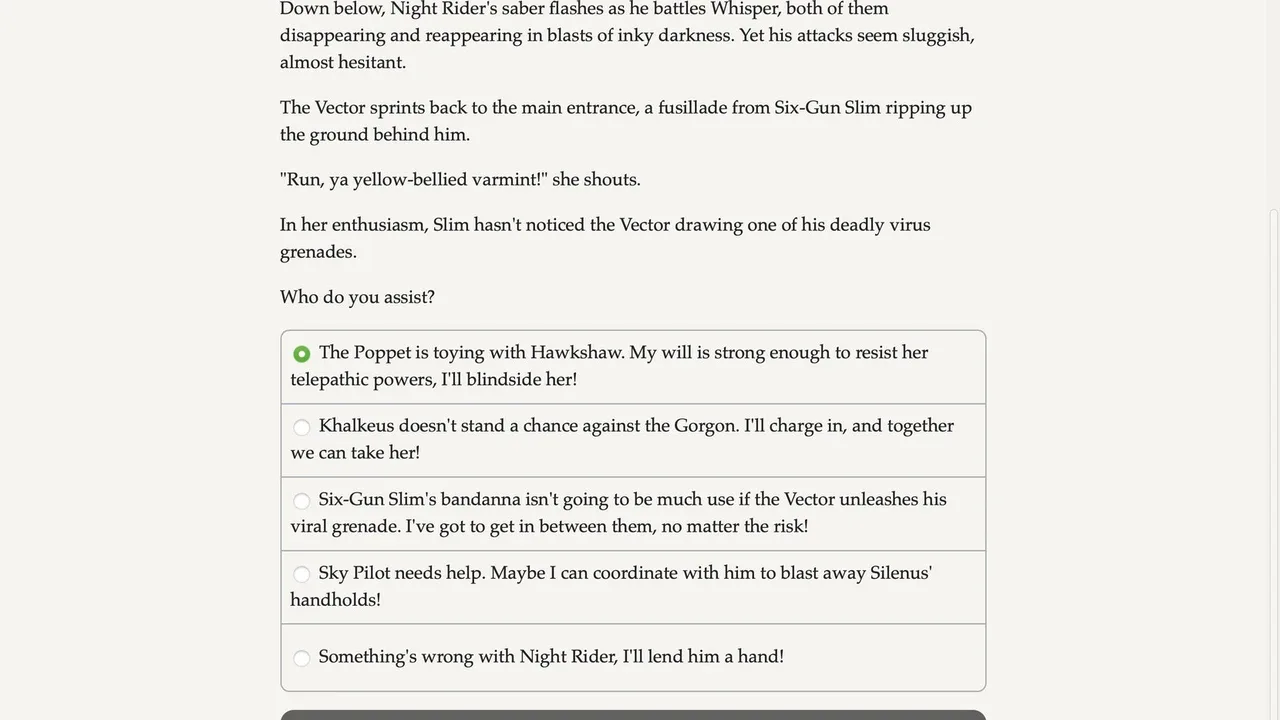Shrug off bullets, smash buildings with your bare hands, and soar through the air as you battle diabolical supervillains! A text-based interactive superhero novel.