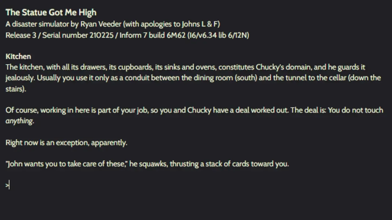 Your job is to make sure John's party is successful. It won't be, though. Written for the Apollo 18+20 tribute album project.