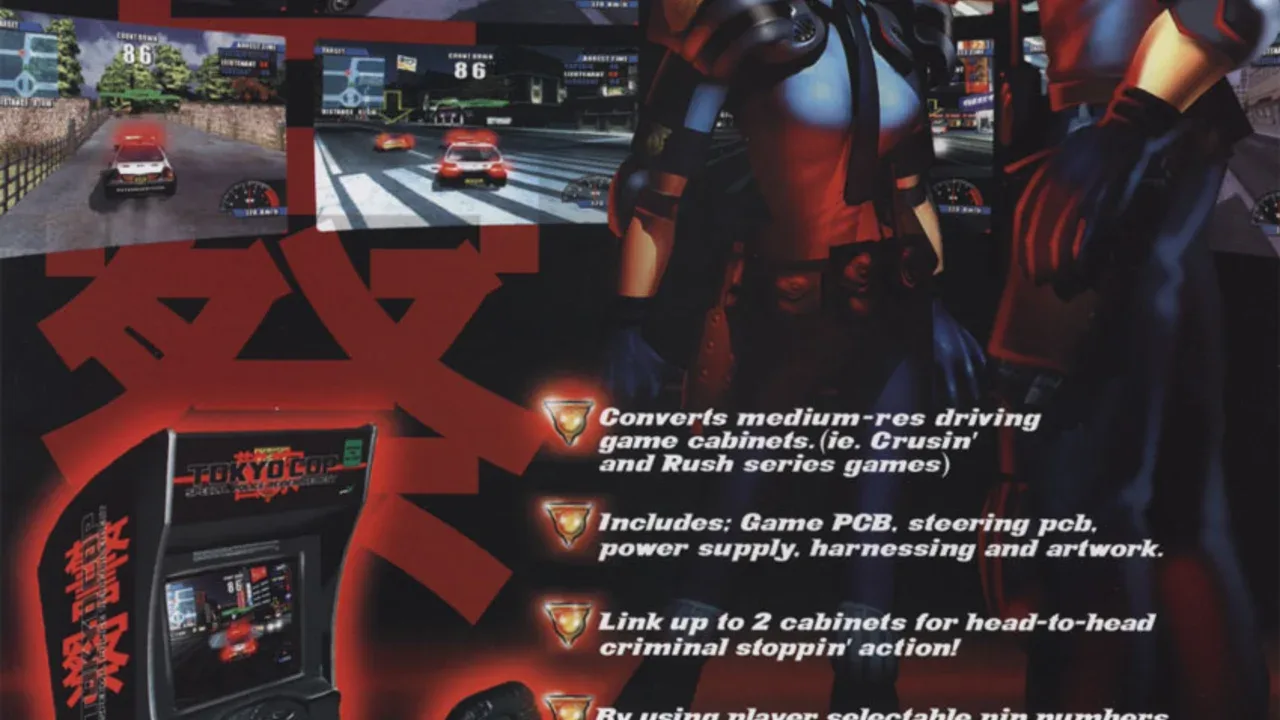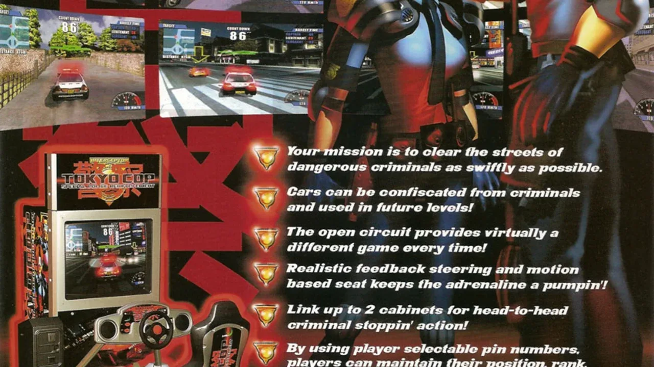 A driving game where the player assumes the role of a cop going after dangerous criminals in Tokyo from pickpockets to the most wanted throughout four districts: Ginza, Hibiya, Shinjuku and Shibuya. A promotion is earned based on how quickly criminals are captured. Different cars are available in each round. The game also has four selectable characters: Isumu, Kazu, Reika and Junko.