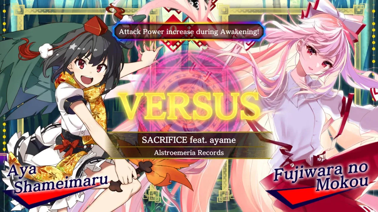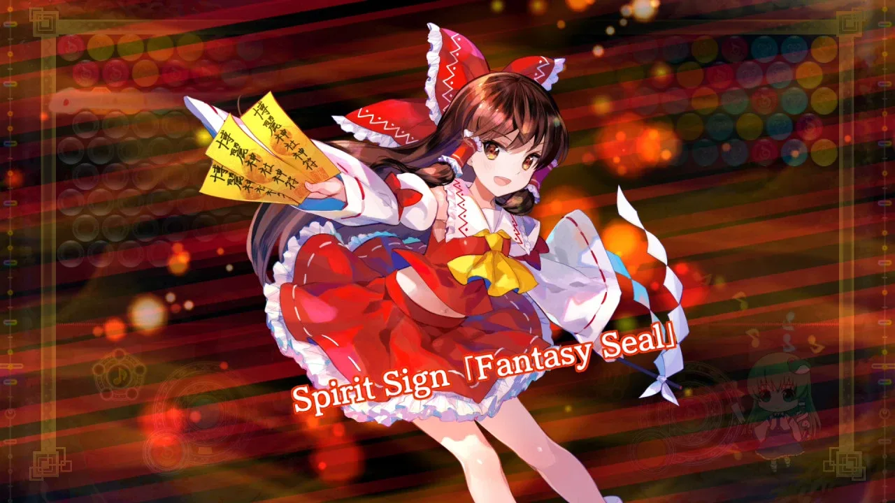 Touhou Danmaku Kagura is a mobile rhythm game. It will be the first dedicated Touhou arrangement rhythm game to be released on smartphones and with gacha mechanics. The rhythm game session will be presenting the character having a danmaku battle against an opponent with a beatmap on the foreground. The player must beat the song played in the battle without missing too many beats.