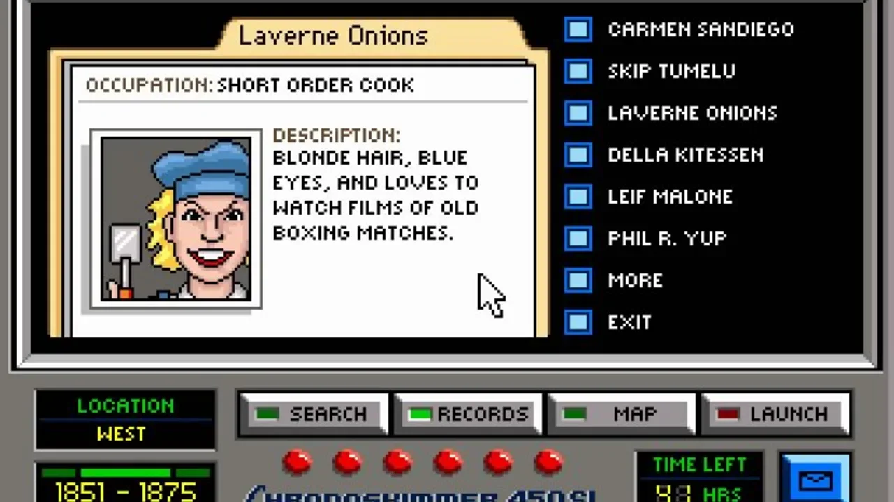 As a detective, the player must hunt down Carmen Sandiego's henchmen, who have stolen outrageous items that are important in US history and heritage. Using clues, the player will follow the henchmen from city to city.