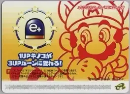 1UP Kinoko ga 3UP Moon ni kawaru! is a Japan-exclusive e-Reader card for use with Super Mario Advance 4: Super Mario Bros. 3. It was released in Series 1 in Japan. It can be used in both the main game and in World-e. Its key art was orange and featured a red outline of Raccoon Mario, specifically him crouching with his tail extended. Once it is scanned, all of the 1-Up Mushrooms in the game become 3-Up Moons. This feature allows Mario and Luigi to accumulate extra lives more easily.