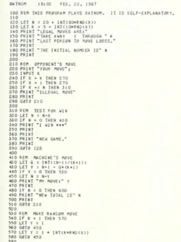 Batnum, a portmanteau of "battle of numbers" is an early BASIC game based on the family of "object pile" games, which includes Nim. The player and computer take turns removing objects from a pile, with there being a set minimum and maximum amount of objects that can be removed per turn. The objective is to force the computer to take the last object.